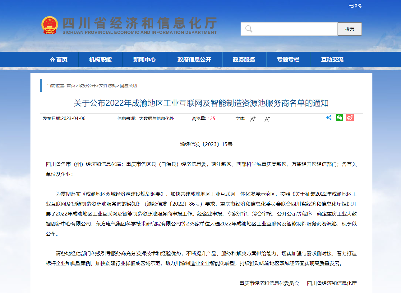 2023年4月6日,重慶市經濟和信息化委員會聯合四川省經濟和信息化廳公布,為貫徹落實《成渝地區雙城經濟圈建設規劃綱要》,加快共建成渝地區工業互聯網一體化發展示范區,按照《關于征集2022年成渝地區工業互聯網及智能制造資源池服務商的通知》(渝經信發〔2022〕86號)要求,重慶市經濟和信息化委員會聯合四川省經濟和信息化廳組織開展了2022年成渝地區工業互聯網及智能制造資源池服務商申報工作。經企業申報、專家評審、綜合審核、公開公示等程序,康碩(德陽)智能制造有限公司入選2022年成渝地區工業互聯網及智能制造資源池服務商單位名單。