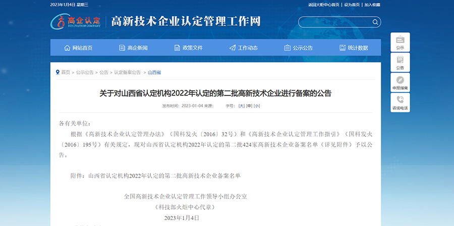 近日,根據(jù)《高新技術(shù)企業(yè)認(rèn)定管理辦法》(國科發(fā)火〔2016〕32號)和《高新技術(shù)企業(yè)認(rèn)定管理工作指引》(國科發(fā)火〔2016〕195號)有關(guān)規(guī)定,全國高新技術(shù)企業(yè)認(rèn)定管理工作領(lǐng)導(dǎo)小組辦公室對山西省認(rèn)定機(jī)構(gòu)2022年認(rèn)定的第二批高新技術(shù)企業(yè)予以公告。康碩(山西)智能制造有限公司(簡稱“山西康碩”)經(jīng)過層層篩選和嚴(yán)格審核,正式通過認(rèn)定,成為高新技術(shù)企業(yè)。獲得此次高新技術(shù)企業(yè)認(rèn)證的殊榮,是在關(guān)鍵零部件領(lǐng)域開拓創(chuàng)新的結(jié)果。