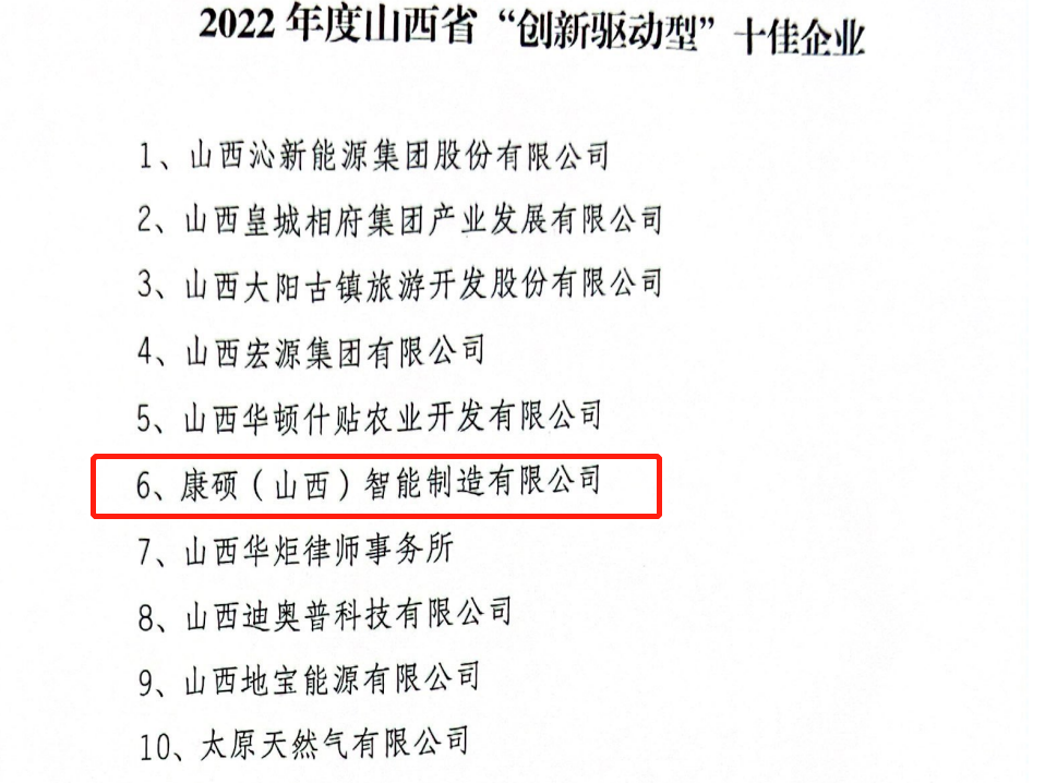 喜報|康碩(山西) 智能制造有限公司榮獲2022年度山西省“創新驅動型”十佳企業