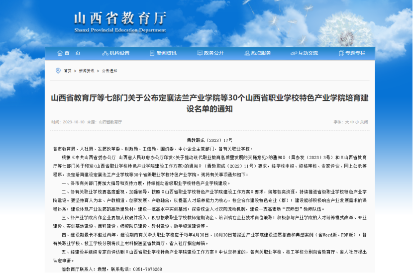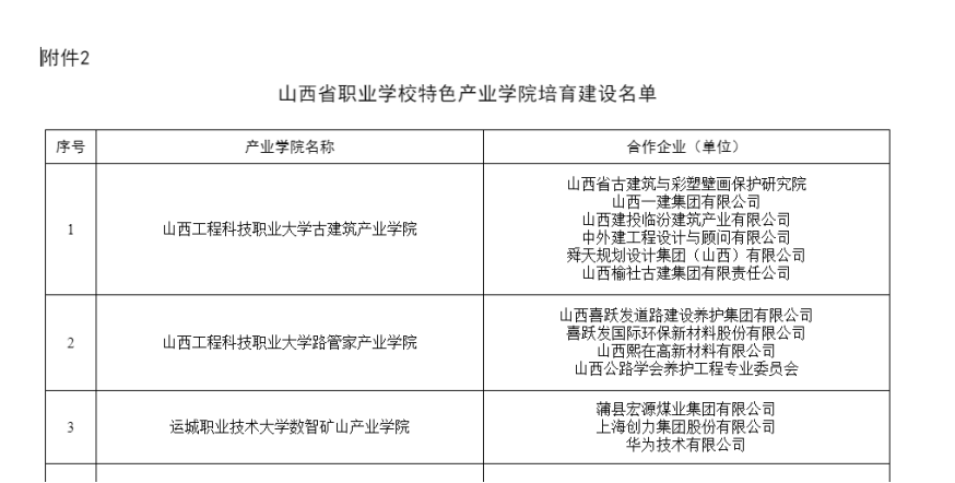 2023年9月25日,省教育廳、省人社廳、省發展改革委等7部門聯合發布通知,公布了定襄法蘭產業學院等30個山西省職業學校特色產業學院培育建設名單。按照《中共山西省委辦公廳 山西省人民政府辦公廳印發<關于推動現代職業教育高質量發展的實施意見>的通知》(晉辦發[2023]3 號)和《山西省教育廳等七部門關于印發<山西省職業學校特色產業學院建設工作方案>的通知》( 晉教職成[2022]11號)要求,經學校申報、資格審核、專家評議,康碩(山西)智能制造有限公司、晉城富士康智能制造職業培訓學校有限公司、山西宏安翔科技股份有限公司聯合申請的“晉城技師學院智能制造產業學院”被列入了“山西省職業學校特色產業學院培育建設名單”: