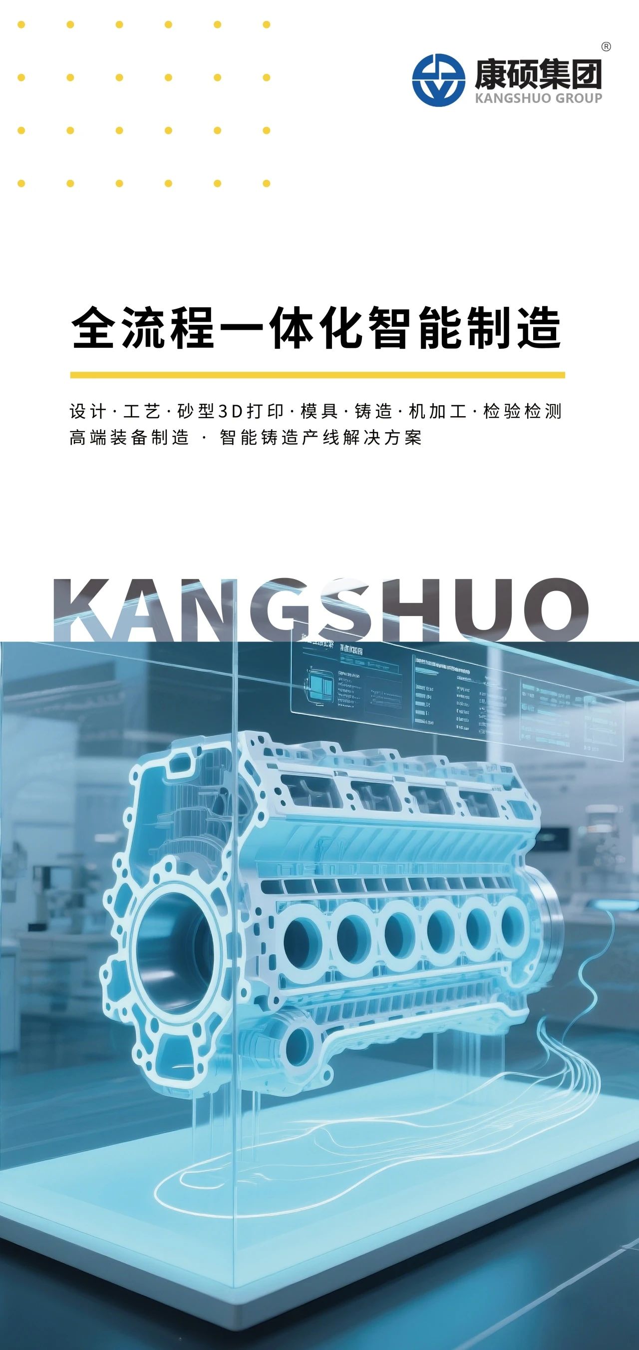 康碩集團一體化智能制造解決方案,完整具備了發動機缸體缸蓋制造領域的四大法寶 - 砂型3D打印解決了"能否造"的問題,數字化綠色鑄造生產線解決了"如何高效造"的問題,精密機加工解決了"如何精準造"的問題,而CAM認證檢驗檢測技術則解決了"如何穩定造"的問題;它們相互配合,相輔相成,共同構成了大型復雜發動機缸體缸蓋制造的完整體系。